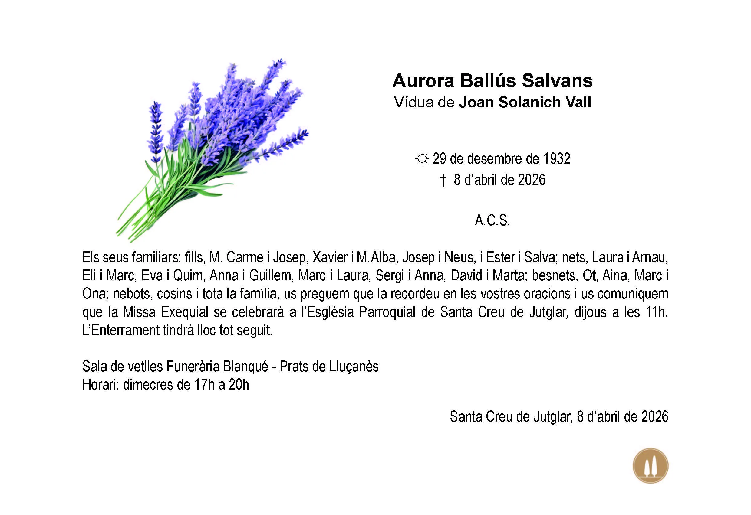 Dimecres 8 d'abril de 17h a 20h a la sala de vetlles de Funerària Blanqué de Prats de Lluçanès