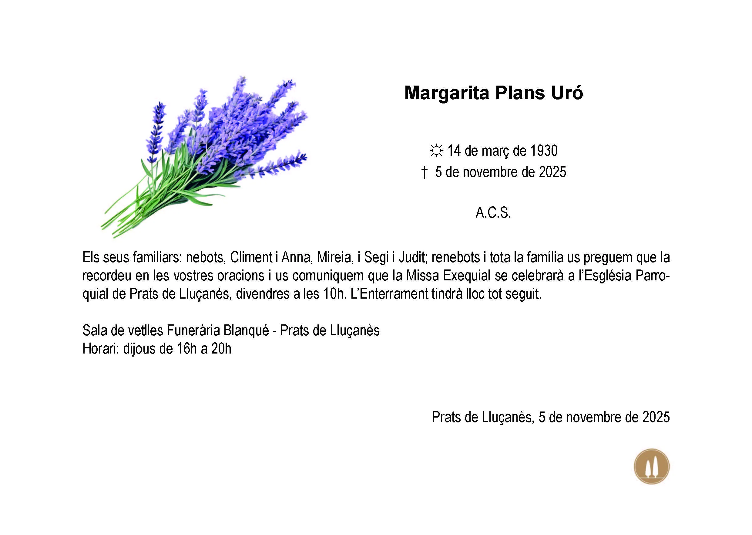 Dijous 6 de novembre de 16h a 20h a la sala de vetlles de Funerària Blanqué a Prats de Lluçanès