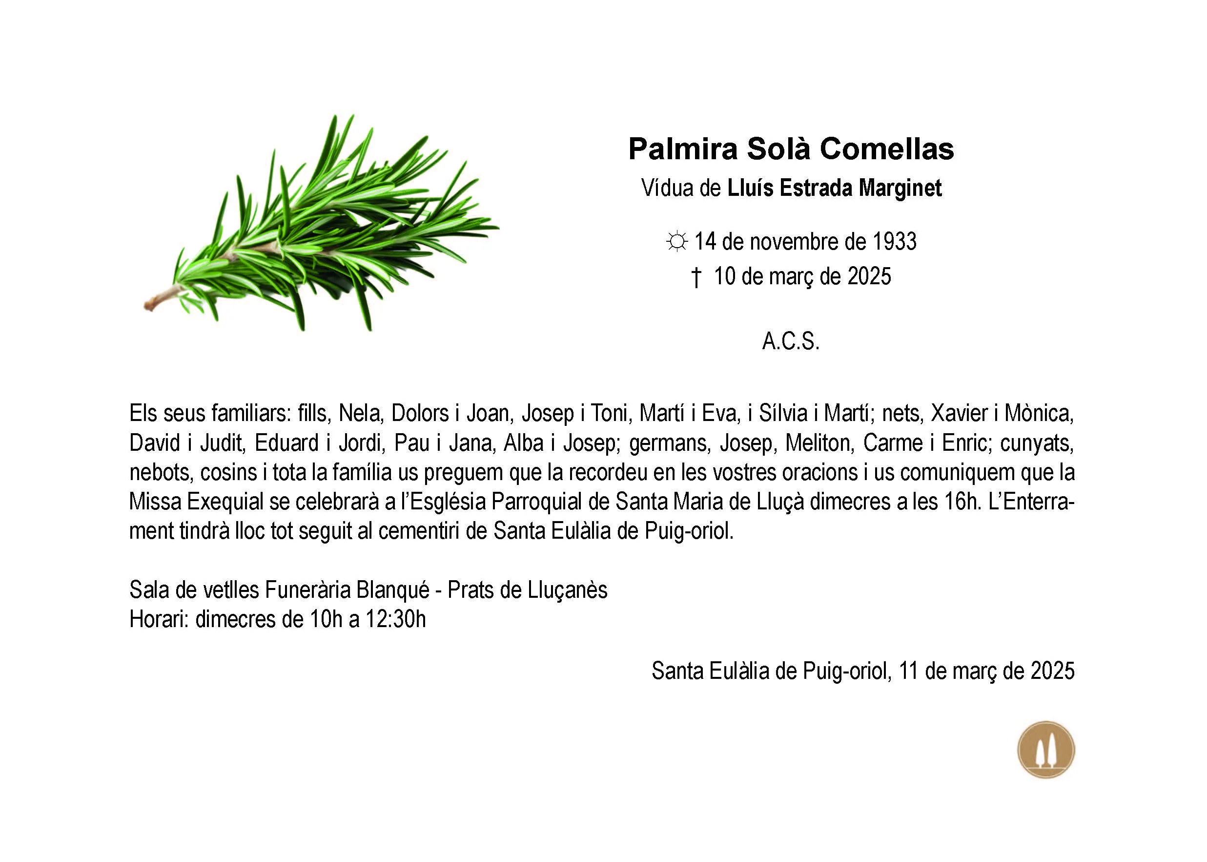 Dimecres 12 de febrer de 10h a 12:30 a la sala de vetlles de Funerària Blanqué, a Prats de Lluçanès.